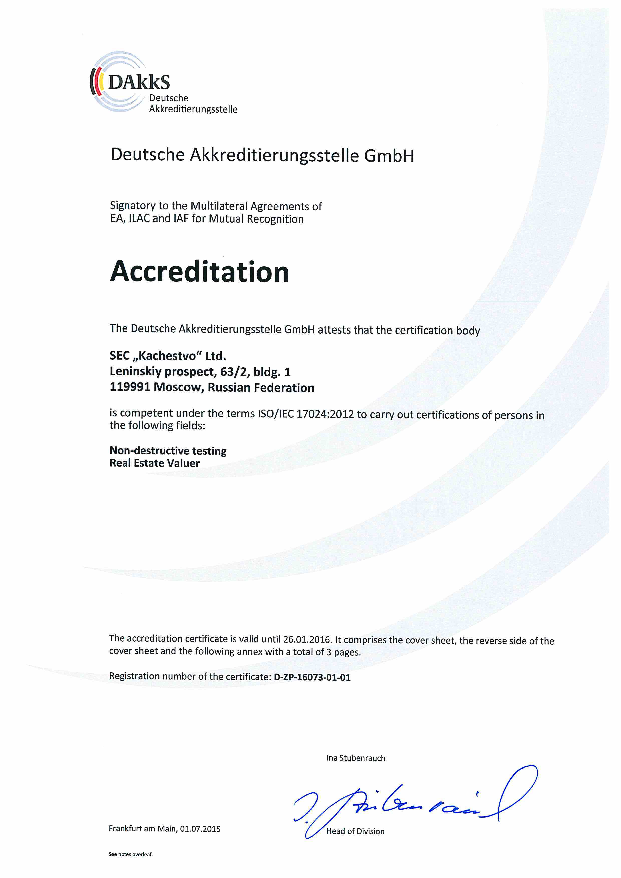НУЦ «Качество» не имеет экзаменационных центров, работающих по ISO 9712, не входящих в выданное DAkkS свидетельство об аккредитации № D-ZP-16073-01-01 от 27.01.2011