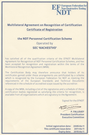 Решением исполнительного комитета Европейской федерации по неразрушающему контролю EFNDT орган по сертификации персонала НУЦ «Качество» вошел в состав европейских центров, сертификаты компетентности которых имеют взаимное признание. Сертификаты специалистов НК, выданные НУЦ «Качество», действуют в странах ЕС и большинстве стран мира.