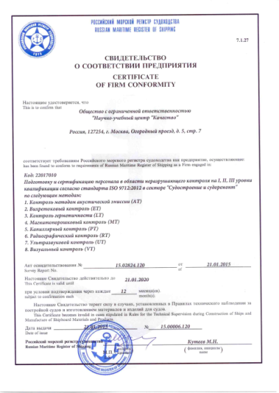НУЦ «Качество» успешно прошел очередной аудит со стороны Российского морского регистра судоходства. По результатам аудита НУЦ «Качество» получил новое свидетельство о соответствии предприятия требованиям Регистра. Область соответствия расширена на вихретоковый метод контроля и метод акустической эмиссии.