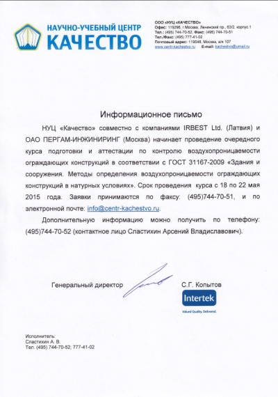Проводится набор заявок на подготовку и сертификацию специалистов по контролю воздухопроницаемости зданий и сооружений. Курс подготовки будет проходить с 18 по 22 мая 2015 года.